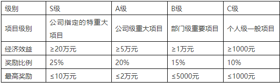 公司推行項目改善從質量、成本、生產、交付、安全、設備改進、團隊及技術改善類等方面推進,不斷完善制度流程化建設,同時建立獎勵機制,按改善項目重要等級分S級、A級、B級、C級,按級別比例進行最高獎勵。