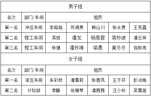 通過(guò)每次的消防演練及消防知識(shí)的培訓(xùn),不僅進(jìn)一步增強(qiáng)了廣大員工的防范意識(shí)和自救能力,了解和掌握如何識(shí)別危險(xiǎn)、如何采取必要的應(yīng)急措施等基本操作,以便在事故中達(dá)到快速、有序、及時(shí)、有效的效果。同時(shí)為了鼓勵(lì)廣大員工能更踴躍的融入到消防演練的集體中,在此次演練評(píng)選出男子組前三名、女子組前兩名,并頒發(fā)了獎(jiǎng)狀及獎(jiǎng)金,以資鼓勵(lì)。獲獎(jiǎng)名單如下: