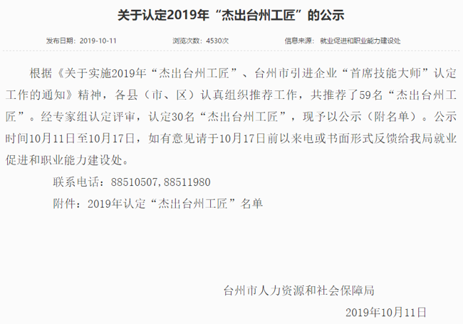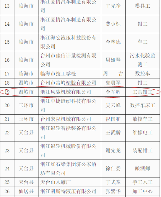 我司根據(jù)《關于實施2019年“杰出臺州工匠”、臺州市引進企業(yè)“首席技能大師”認定工作》的通知要求,通過公司推薦,資格初審,經專家組認定評審,我司研發(fā)中心工程師李軍輝成功順利入選被評選為“杰出臺州工匠”,并在網上予以公示,符合公司的價值觀“客戶為先、誠信負責、團隊合作、務實創(chuàng)新”精神。